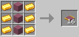 To craft a Magenta Terracotta Embedded Gold Track, put 6 Gold Ingots down the left and right of the crafting table and put 3 Magenta Terracotta down the center.