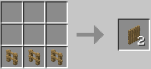 The Wooden Picket Fence is crafted by filling an entire row of the crafting grid with three wooden fences of the desired wood type. This recipe produces two Wooden Picket Fences.