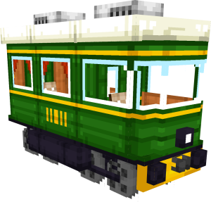 The tram uses redstone as fuel and can haul up to five cars. It has a weight of 'one' and can carry up to two additional players or villagers besides the driver. It is built for short-distance travel, frequent stops, and tight city layouts.